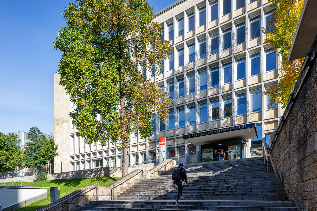 We are going to use the rooms HS BMT and BMTEG038. Enter the building via the large staircase (or ramp), and once inside, go to the right and through the glass door.